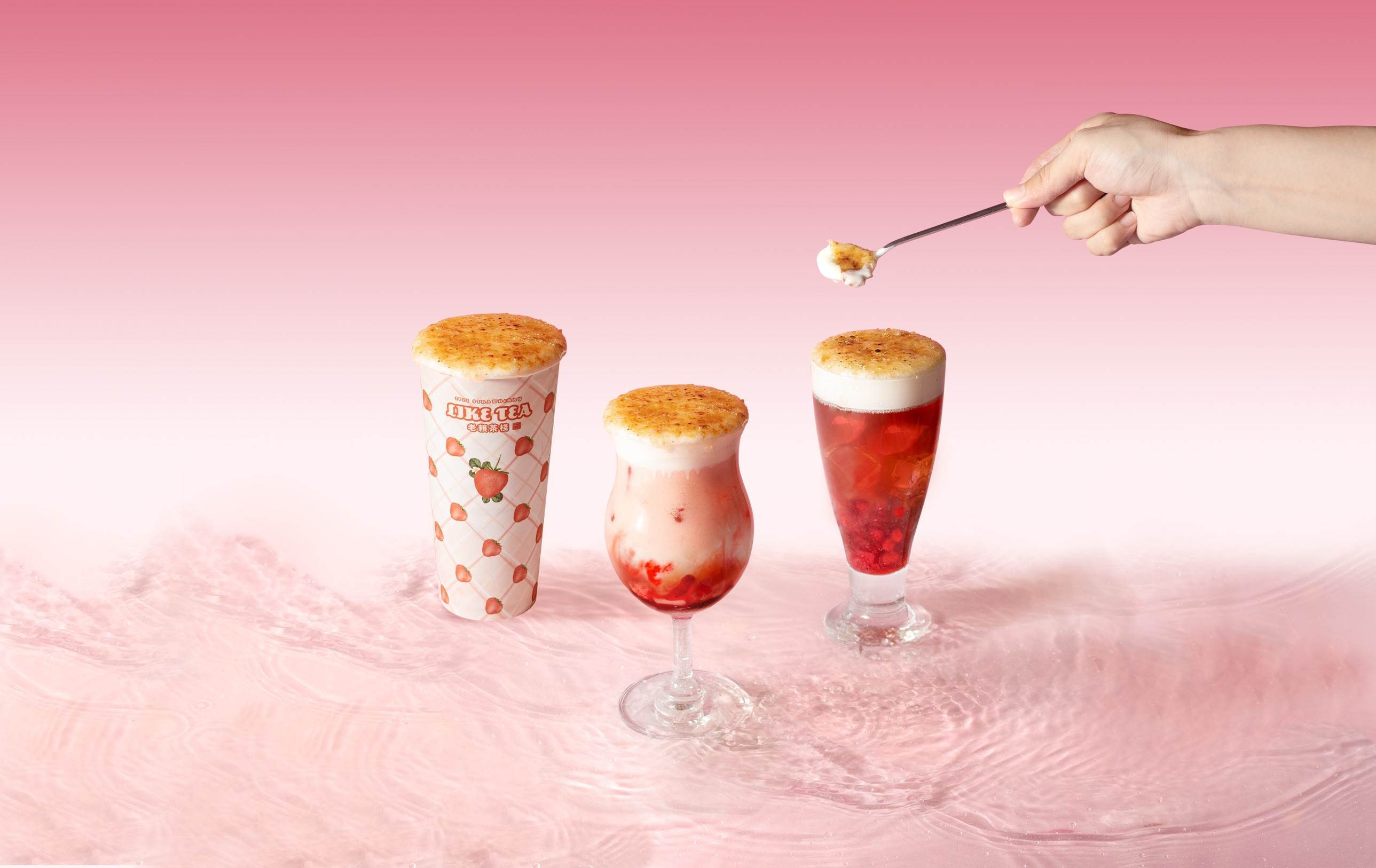 老字號老賴茶棧也在草莓季端出新花樣,將社群爆紅的烤糖奶蓋正式與新鮮草莓結合。焦糖脆片、海鹽奶蓋與草莓果粒交疊出「喝得到也咬得到」的層次感,每一口都是焦糖脆甜、新鮮草莓與茶香的完美融合,再加上粉色限定杯身,成功吸引年輕族群目光,傳統品牌用新口味說新故事,也替自己打開不同世代的市場。