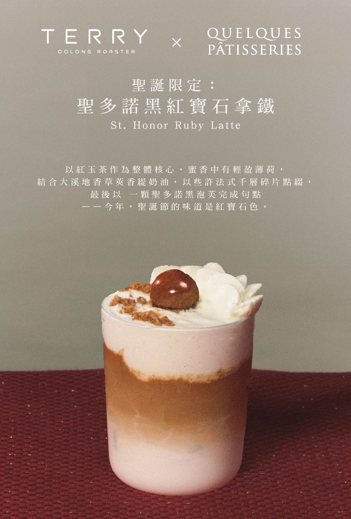 偏向職人系路線的泰利洋行,則選擇用甜點語彙來詮釋聖誕限定。攜手法式甜點品牌某某甜點,推出「聖多諾黑紅寶石拿鐵」,以紅玉茶為基底,結合香緹奶油、千層酥片與泡芙元素,讓熟悉的法式甜點在茶拿鐵中重新被演繹。喝的不只是飲料,更像是一杯可以慢慢拆解風味的甜點作品。