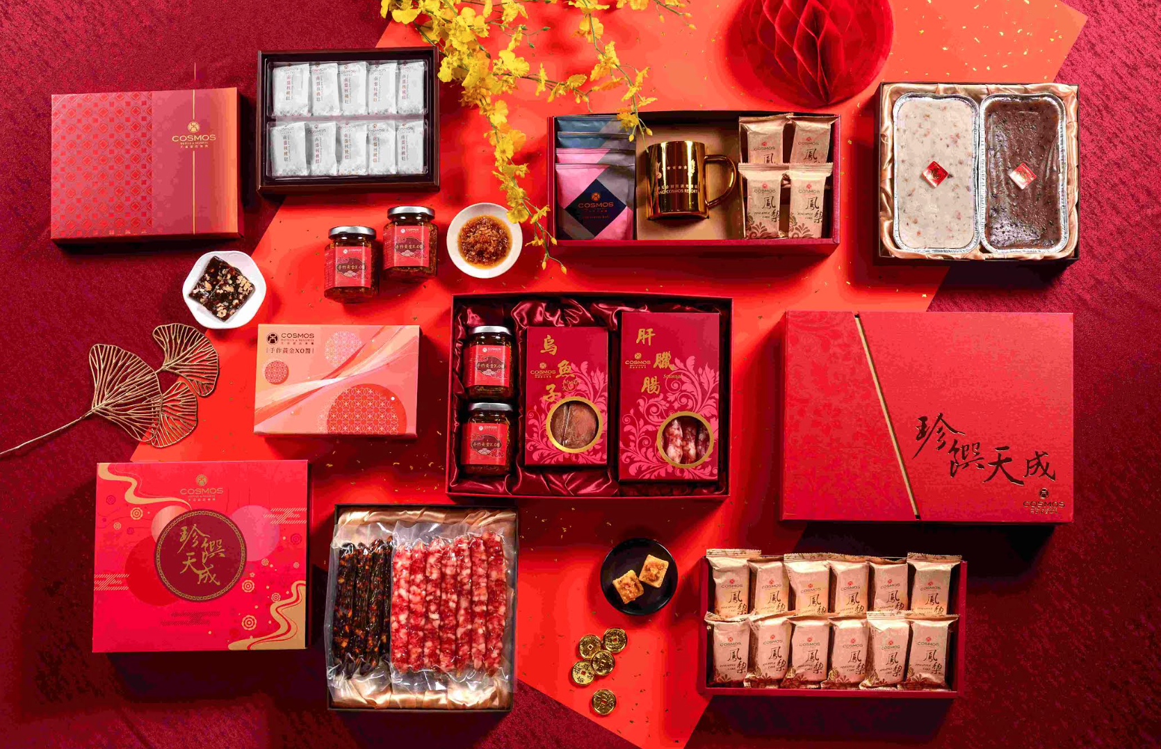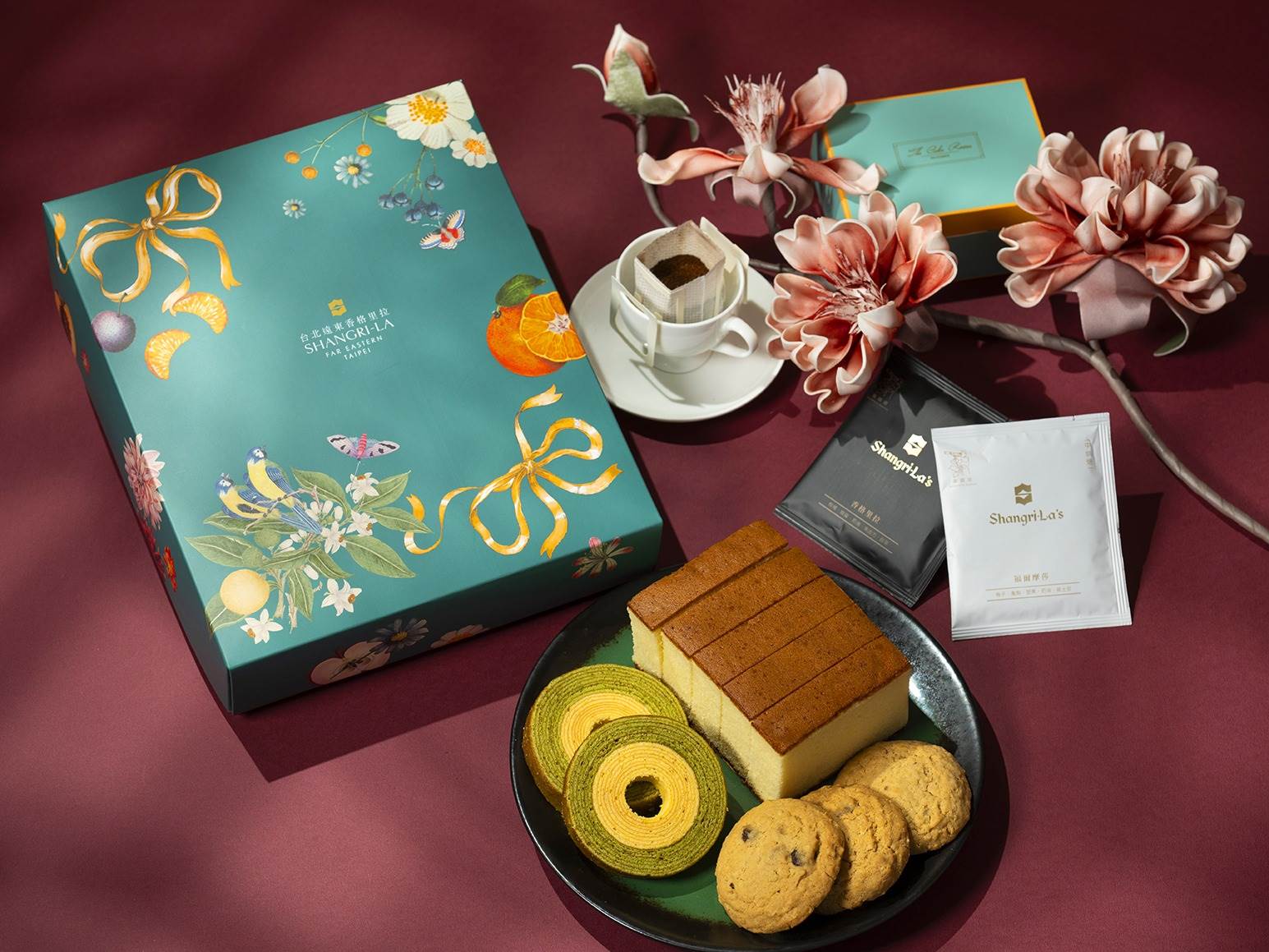 台北遠東香格里拉今年索性把The Cake Room打造成精品年貨大街,從糕點、禮盒到冷凍佳餚一次備齊。除了寓意吉祥的酥餅與年糕,也推出結合蜂蜜蛋糕、咖啡與茶點的新款禮盒,風格實用又不失質感。高端市場則以氣泡酒、紅酒與鮑魚、烏魚子組成的禮籃作為主打,從親友走春到企業送禮,都能找到合適選項。