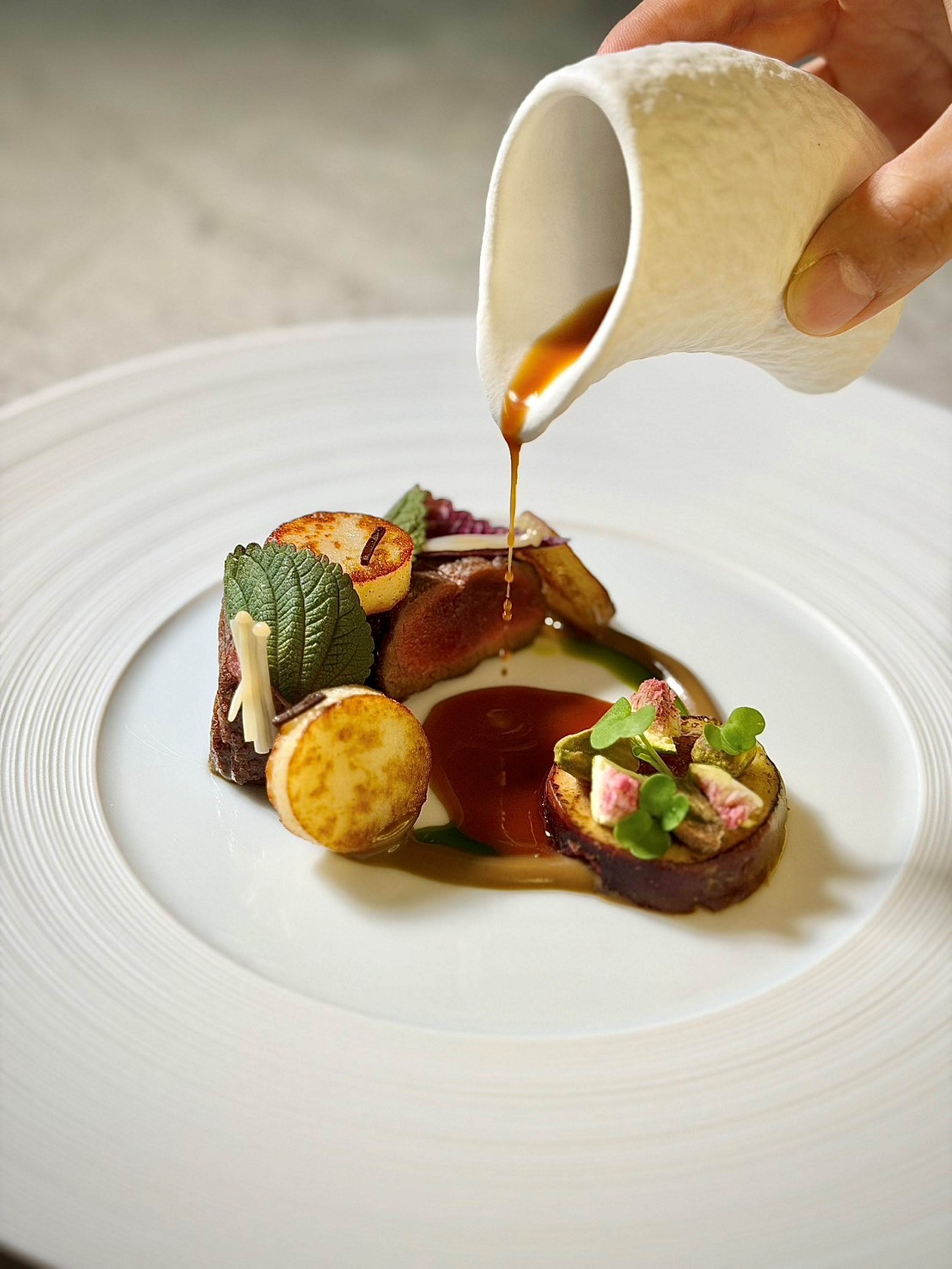 料理中可見土魠魚、青海菜、明蝦、刈菜鴨湯等家鄉符號,被轉譯成細膩又克制的當代法餐,讓人吃的不只是技巧,而是一段被保存下來的風土記憶。