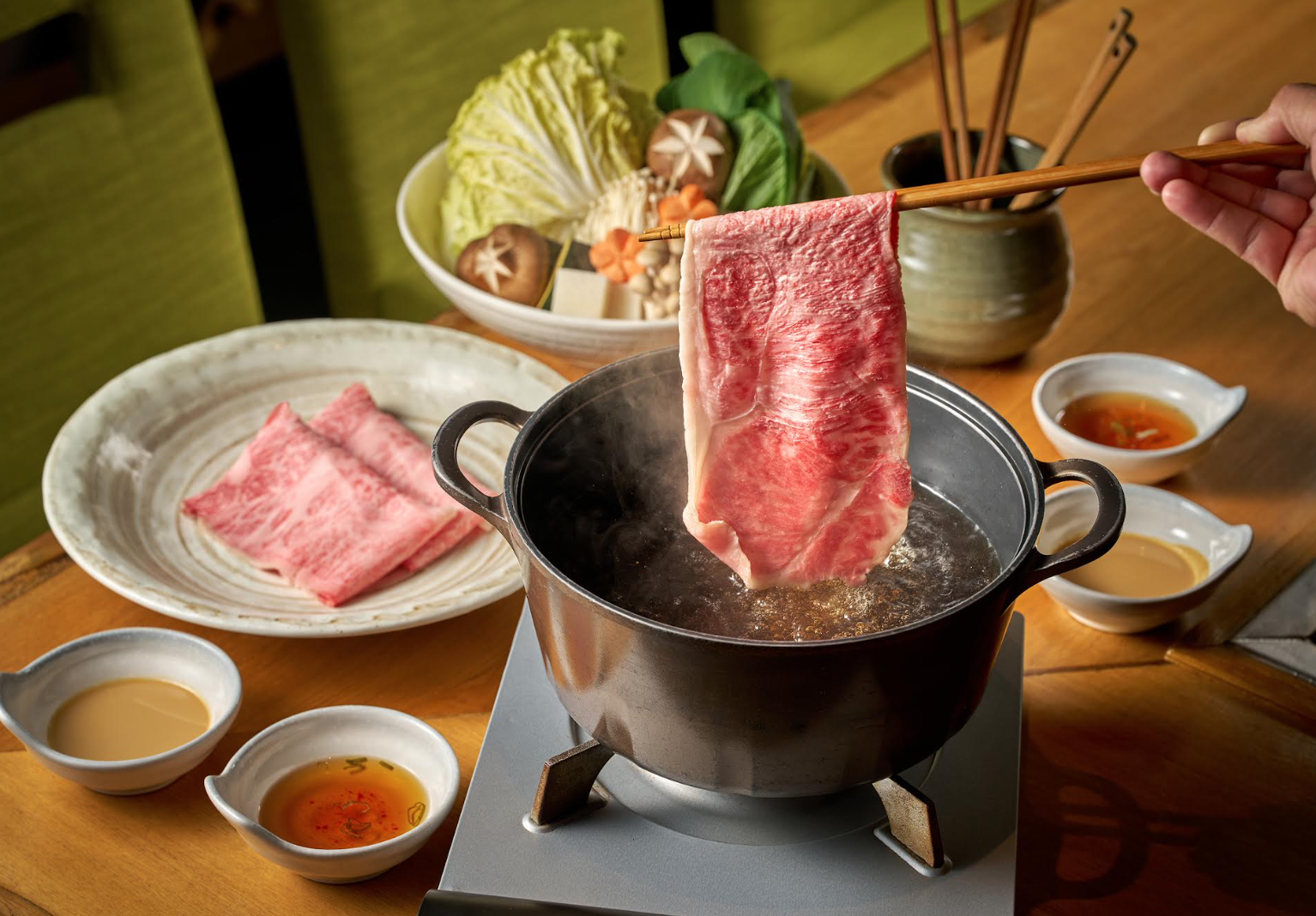 台北美福大飯店的晴山日本料理,於年底前限時推出「極品飛驒牛」系列,以清涮、壽喜燒、炭烤與鐵板等不同手法,完整呈現飛驒牛細緻油花與優雅肉香。透明高湯涮煮、傳統壽喜燒不加水的作法,讓肉脂風味毫無保留地釋放,是冬天最適合慢慢享用的料理。