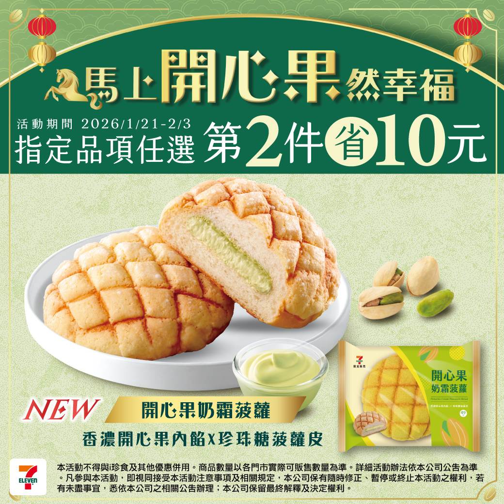 近期超商甜點明顯吹起開心果風,這款開心果奶霜菠蘿就是代表作之一。外層菠蘿酥皮香氣十足,內餡奶霜融合堅果風味,濃郁卻不厚重。同系列還有蛋糕與千層塔選項,主打「馬上開心」的諧音話題,也成功讓節慶概念落實在口味上。