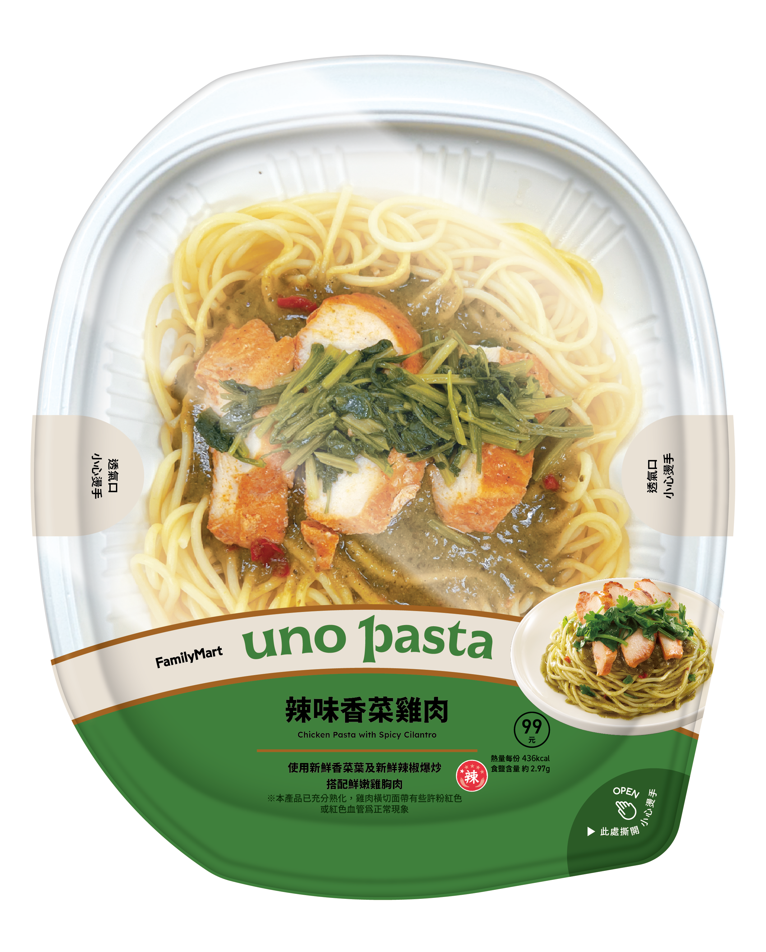 率先出招的全家便利商店,延續去年「香香菜菜霜淇淋」掀起的社群熱度,再推兩款香菜系主食與輕食。主打正餐市場的「辣味香菜雞肉義大利麵」,來自全家旗下uno pasta系列,以香菜清香作為醬汁基調,搭配甜紅椒粉醃製的匈牙利雞胸排。雞肉帶著溫和辣度,與麵條的香氣交織後,再拌入炒香菜收尾,入口不嗆卻層次分明,屬於「越吃越順」型的香菜料理。