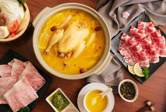 招牌「黃金花膠雞湯鍋」搭配玉米雞、海鮮與高級肉品,是不少饕客心中的補湯代表;另一款「剝皮辣椒酸白菜雞湯鍋」則在濃湯中加入台式元素,辣、酸、鮮一次到位,特別適合想換口味的人。