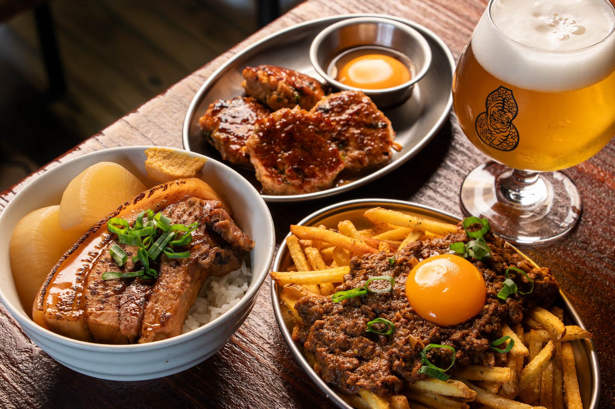 如果說高級餐廳是精緻派,那東門的「臺虎居餃屋」就是春天的放鬆系代表。3月中旬起推出期間限定「櫻花祭」,把日式居酒屋氛圍直接搬進城市日常。主打的「角煮丼飯」,用慢燉三層肉搭配白蘿蔔與越光米,溫潤又紮實;而「月見系列」則玩得更有趣,像是月見雞肉丸、月見咖哩薯條,濃郁蛋黃一劃開,直接讓人食慾暴走。