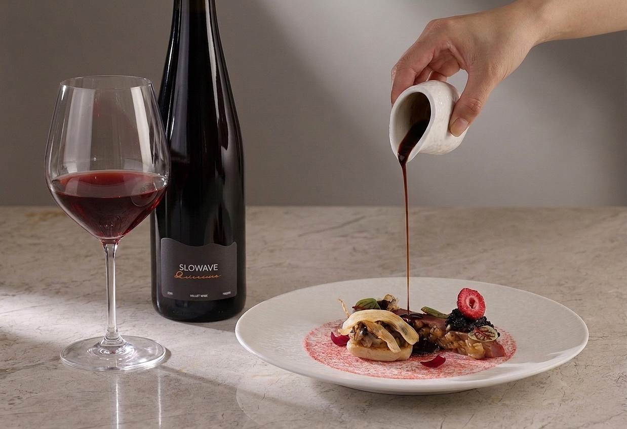 近年餐酒搭配越來越講究,而這次SLOWAVE攜手米其林一星餐廳推出的「風土粟酒」計畫,則反其道而行,不是先有菜,而是「以酒設計料理」,三款粟酒依序帶出酸度、油脂與花香,搭配從櫻花蝦創意小點,到油封鴨腿主菜,每一道都圍繞酒的風味展開。這樣的設計,讓酒不再只是配角,而是整場餐桌的節奏核心。對喜歡嚐鮮的饕客來說,這是一場很有意思的味覺實驗。