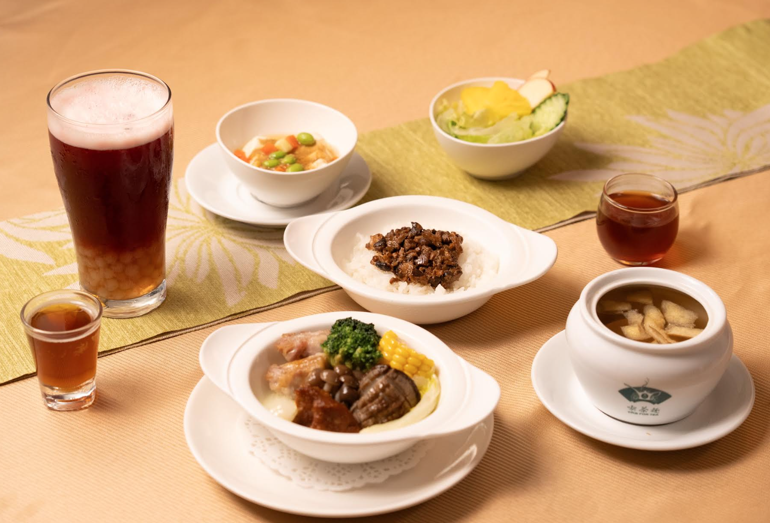 天仁茗茶旗下的喫茶趣,這一季主打「茶入料理」,簡單說,就是讓茶不只是喝的,而是吃進每一道菜裡。像是包種茶入菜的鮑魚西魯肉,把辦桌靈魂料理升級成更清爽細緻的版本;茶燻手工火腿則帶出淡雅煙燻與茶香交織的層次。如果你偏好清爽系,蔬食版本「美人山海蔬香匯」也很有誠意,完全打破「蔬食等於無聊」的刻板印象。