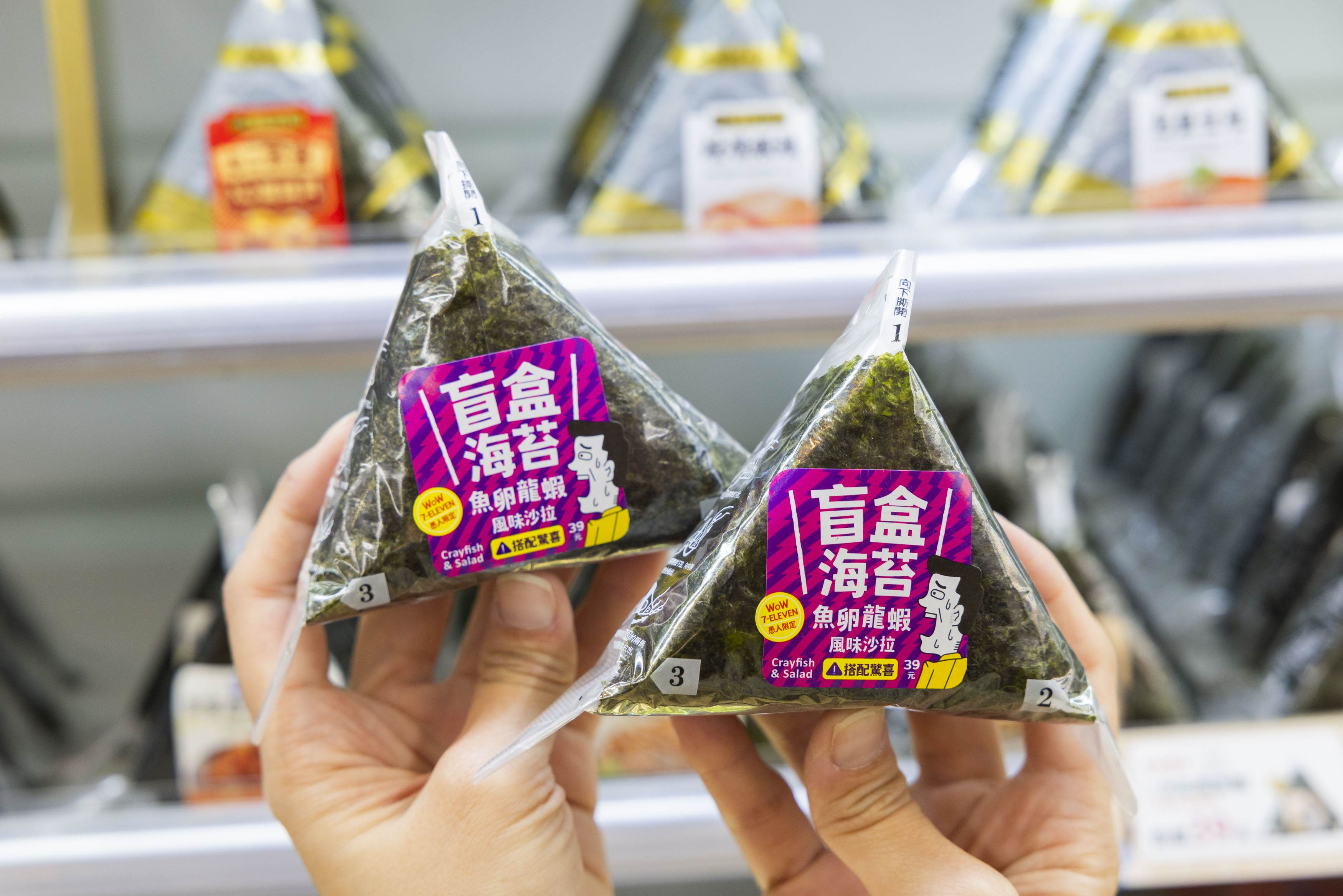 同樣來自7-ELEVEN的還有「魚卵龍蝦風味沙拉盲盒御飯糰」最大特色在於「隨機海苔」設計,醬油、大蒜、奶油甚至香菜口味都有可能出現。每一口都像開盲盒,讓吃飯變成一場小型冒險,也成功抓住年輕族群的玩心。
