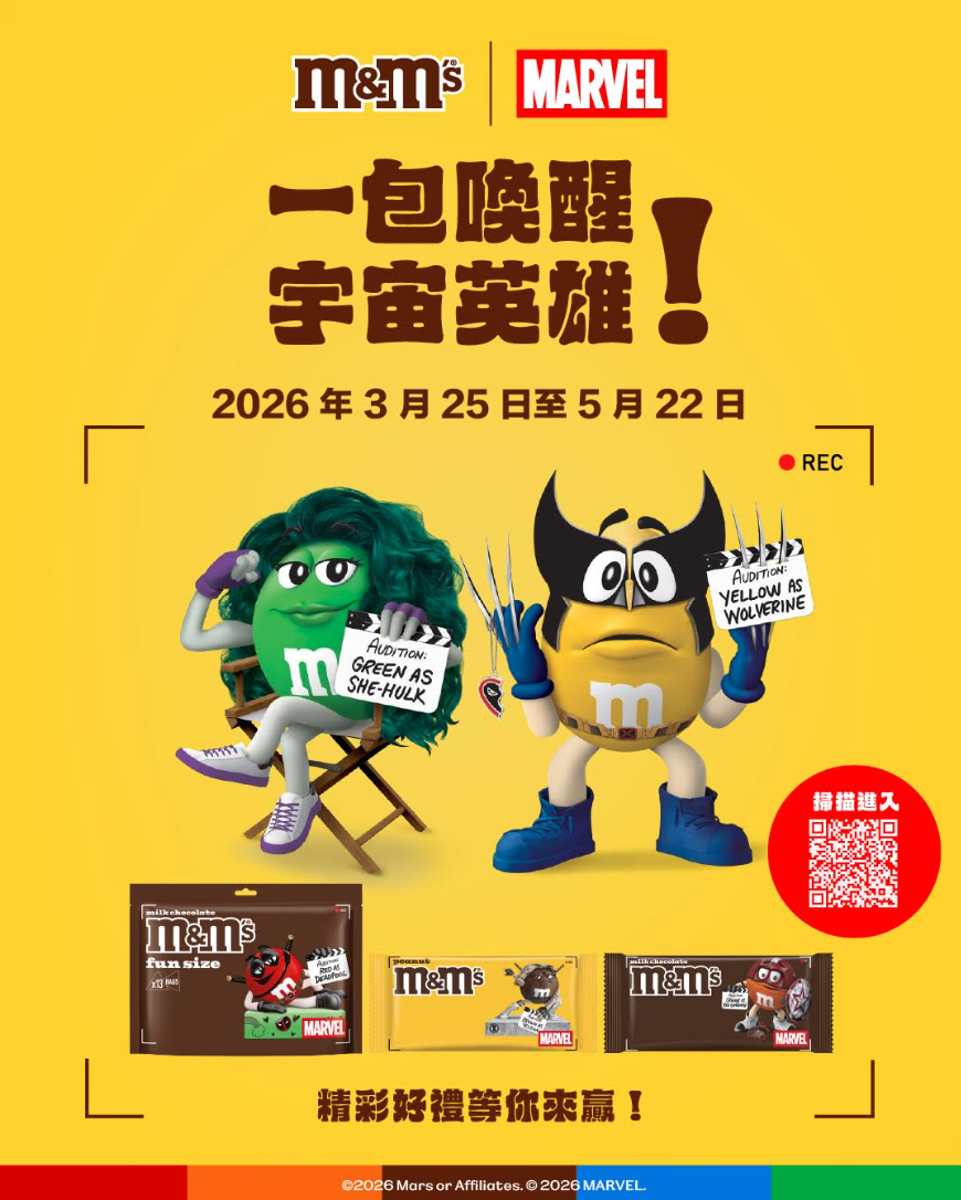 甜點不只停在味覺,這波連娛樂感都加進來了。M&M’S攜手Marvel推出聯名活動,從角色包裝到線上互動遊戲,把巧克力變成一種「可以玩的甜點」,像是把經典M豆角色變身為金鋼狼、死侍等超級英雄,不只吸引粉絲收藏,也成功讓日常零食多了一點故事感。再搭配抽獎與數位互動機制,讓吃巧克力這件事,變成一場參與式體驗。