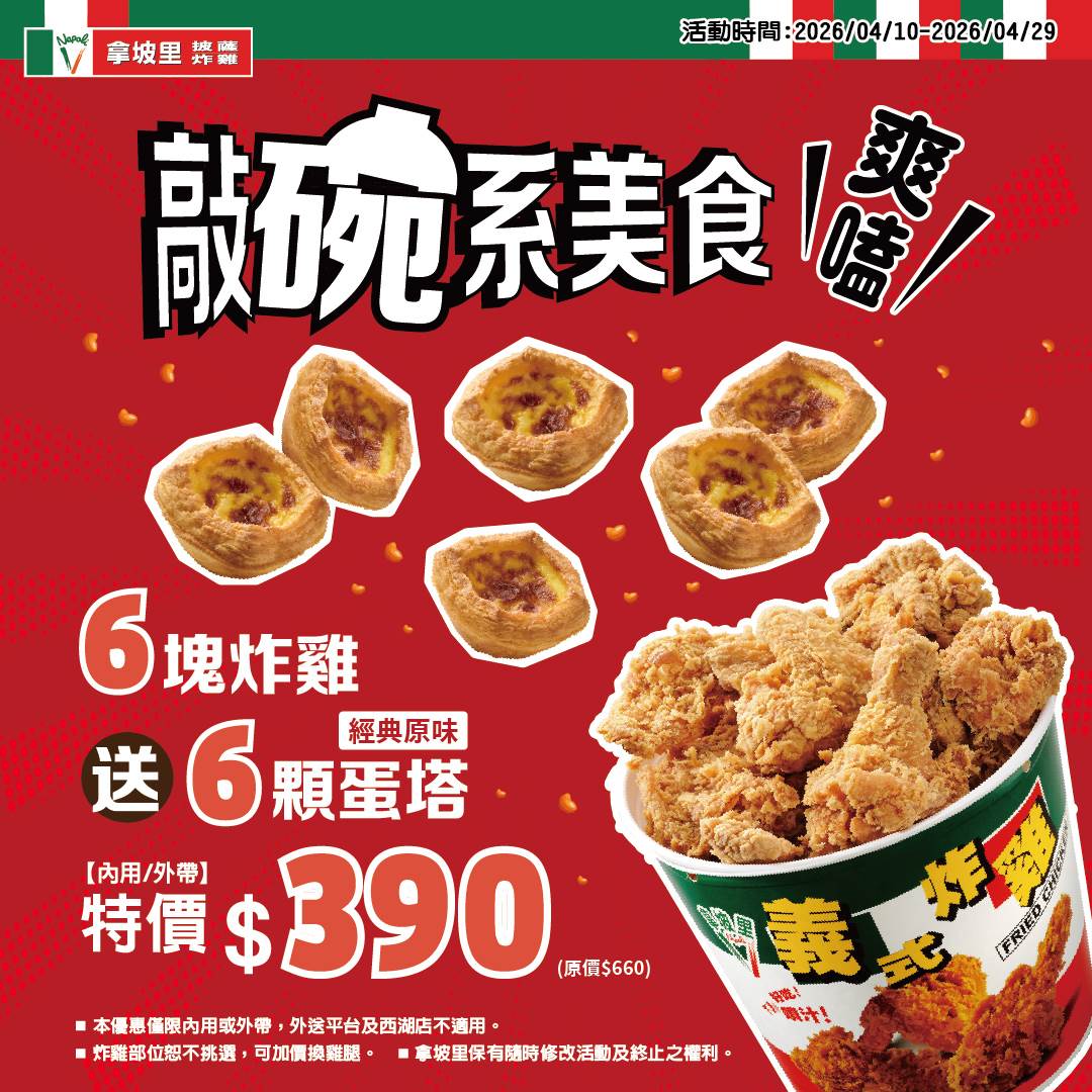 有時候最打動人的,還是熟悉的味道。拿坡里這次主打「敲碗回歸」,讓人氣蛋塔再次登場,搭配炸雞推出超值組合。酥脆千層蛋塔配上多汁炸雞,鹹甜交錯的經典組合,簡單卻很難被取代,也證明了。再多創新,經典永遠有市場。