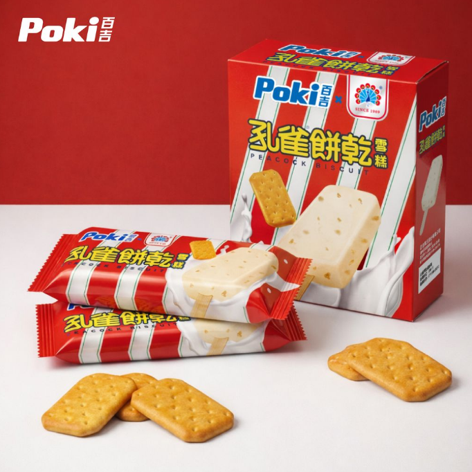經典「孔雀餅乾」這次不只在零食櫃出現,而是直接變成雪糕,濃郁奶香冰體裡,包著餅乾碎粒,咬下去是軟與脆的交錯。這種熟悉又陌生的口感,很容易讓人邊吃邊回想小時候的放學時光。