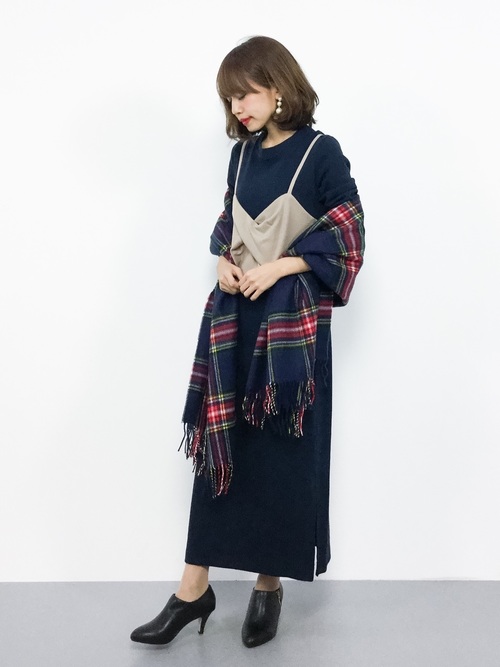 整體造型統一選用深藍色時,給人一種沉穩的感覺,如果全身上下都採深色系的服飾,這時選擇有點紅色的格紋大披肩,整個形象會變得明亮起來喔!