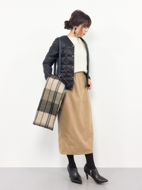 米色鉛筆裙流暢的線條看起來有修長的效果,讓你的穿搭更顯時尚♪手上拿著的大披肩,選擇與鉛筆裙相同配色的米色格紋,讓整體穿搭有一致感而且散發出成熟女人的氣質。手上拿的大披肩要摺整齊,這樣才能給人一種感覺很可靠的印象喔!