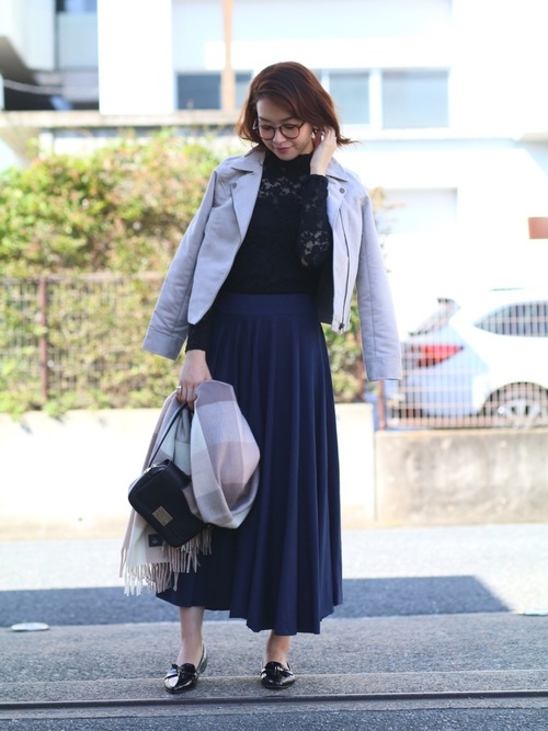 上身選穿皮外套的話比較合身,所以下半身選穿傘狀長裙,有拉長腿部的效果。隨性抓在手上的大披肩,給人一種自然不刻意打扮的時尚感♪