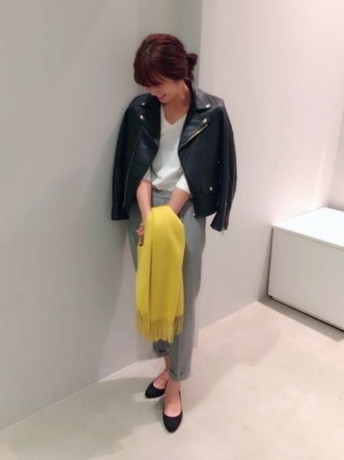 黑色皮外套搭配黃色大披肩,展現出精神奕奕的大人女孩風穿搭♪選擇長度露出腳裸位置的長褲,可以帶給人一種成熟小女人的感覺。