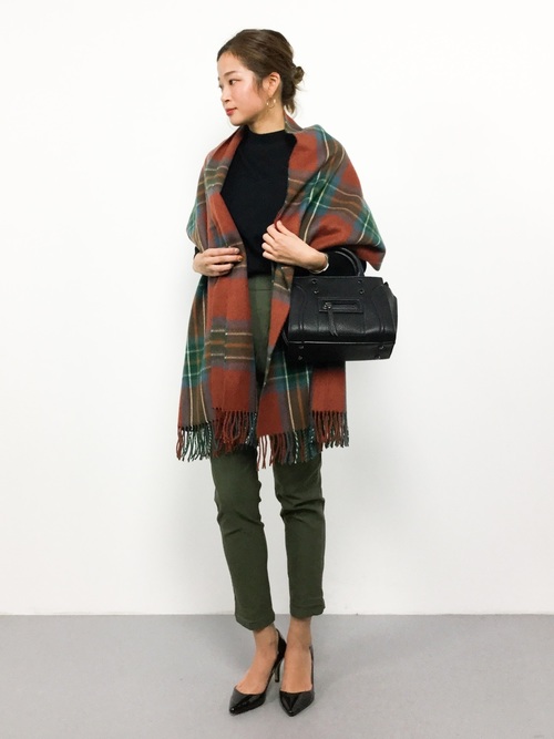 黑色上衣加軍綠色長褲的搭配,這種成熟的穿搭,流露出穩重氣息,在大披肩的選擇上不要那種過於華麗的顏色。配合長褲的顏色,選擇有綠色線條的格紋大披肩,就是一款適合粉領族的時尚穿搭了♪