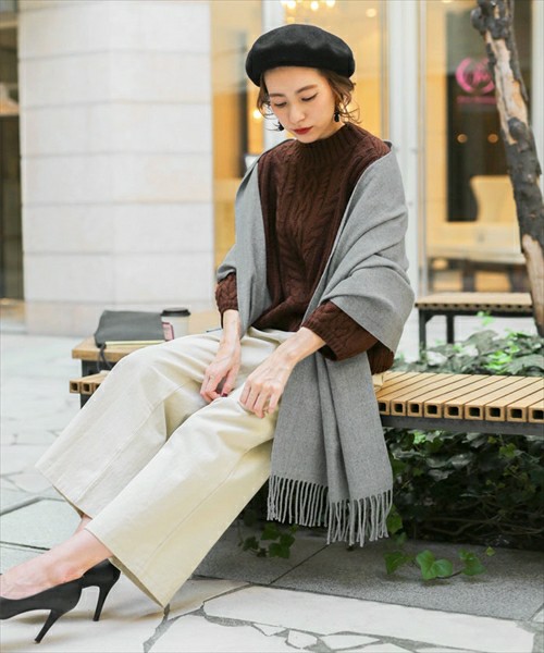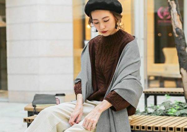 大披肩圍在頸部周圍而且把下巴都埋起來的話,會有小臉的效果呢♡選擇稍微厚一點的麻花毛衣,搭配合身剪裁的長褲,展現好身材