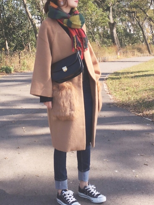 穿上毛毛口袋圓領大衣時,圍圍巾讓頸部成為焦點♪丹寧褲加運動鞋的休閒穿搭,在選擇圍巾時要挑選明亮的顏色,讓整體感覺青春洋溢