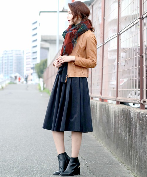 焦糖色皮外套加喇叭裙是同時呈現冷酷和甜美的絕佳組合♪大披肩選擇適合與外套搭配的顏色,讓整體的色彩充滿協調感。