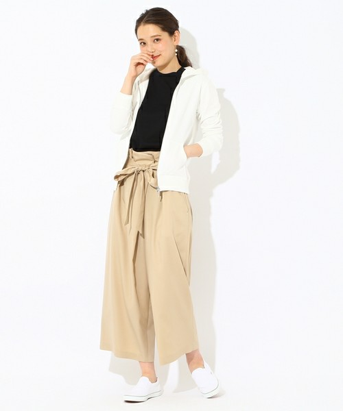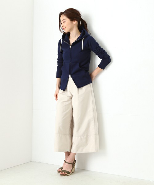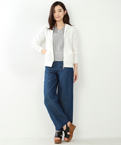 上下雙開的拉鍊帽T與寬褲還有寬版的單品做搭配,就可以打造出合身&魚尾裙效果的女性裝扮。休閒的帽T也可以簡單漂亮的穿搭。領口選擇V字領,可以讓鎖骨看起來很性感外還有小臉的效果。