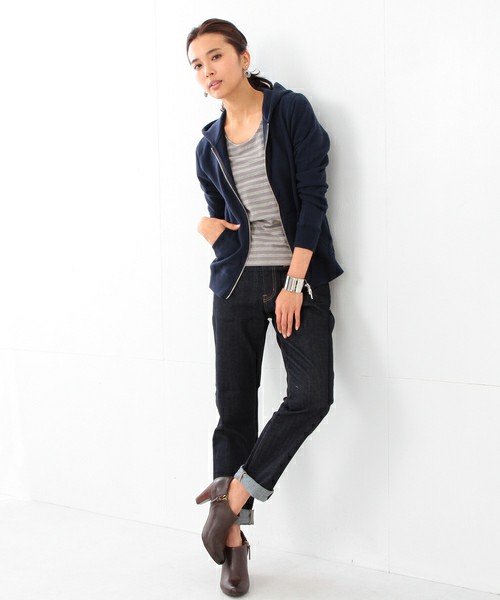 古著感鄉村風橫紋搭配暗色系帥氣丹寧的成熟女子穿搭。樸素的灰色與金屬配件還有皮革等天然素材很相襯,所以也可以拿來搭出配件的時尚♪