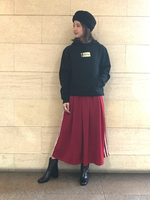 用運動風穿出成熟可愛的帽T街頭搭配。寬口的裙子可以增加質感的穿搭很時髦。黑色×紅色兩色的存在感營造出帥氣風格。