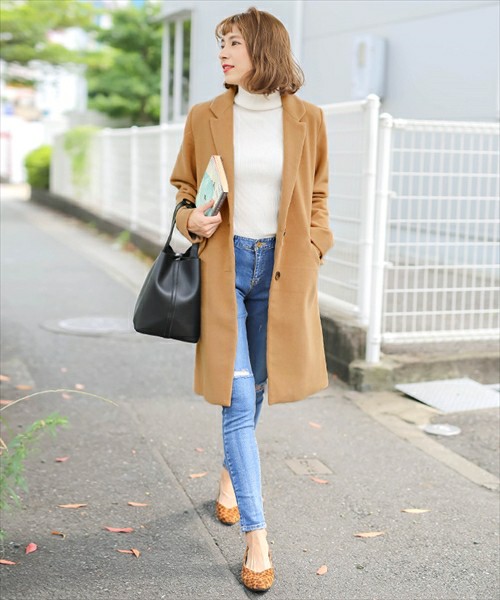 亮棕色的大衣外套,搭配駝色或白色系的同色系單品相當合適。 穿上豹紋圖案的鞋子,整體看起來擁有大人成熟的優雅氣質。