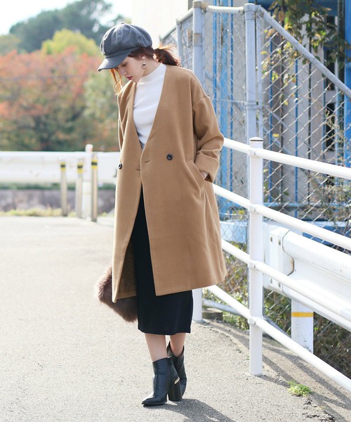 無領駝色大衣外套是休閒風格的推薦單品。 戴上報童帽使得冬季穿搭更加可愛,單一色系或是棕色系的單品讓整體看起來散發成熟氣質。