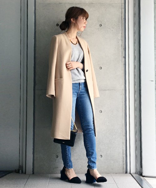 若是想讓無領大衣外套穿起來美麗,可選擇淺棕色凸顯高貴優雅氣質♡ 穿著針織衫與牛仔褲的簡單搭配,再披上大衣外套,大人的成熟時尚風格便大功告成。