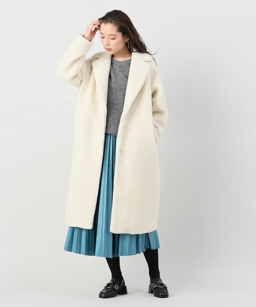 稍大版型的毛絨大衣外套,是今年的流行重點。 尤其白色外套更能凸顯上衣及褲子的顏色, 再搭配深綠色百褶裙更能襯托冬季沉穩的感覺。