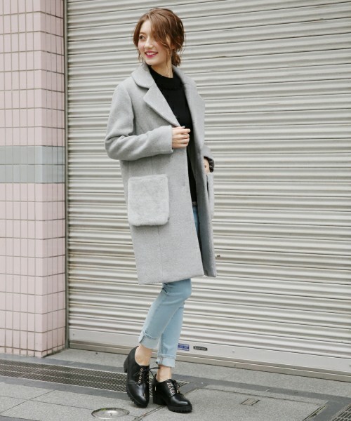 大片圓領的衣領設計與今年流行的毛絨口袋大衣外套,淺灰色更能凸顯優雅氣質。 細身的版型設計穿起來非常好看,推薦給大家。 上衣或鞋子可穿著黑色,藉由搭配同色系來強調統一感,也能凸顯整體的時尚率性風格。