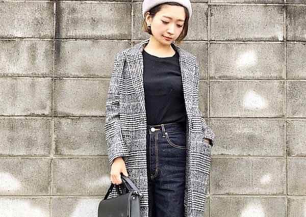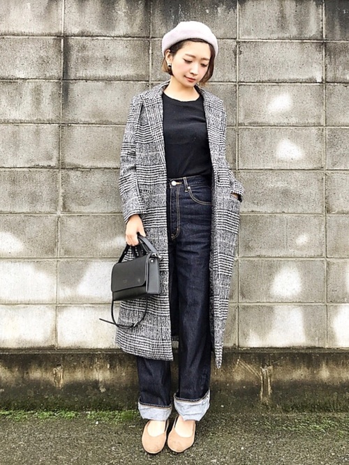 為了不讓長版大衣外套顯得俗氣,可穿著寬版牛仔褲,使整體看起來更加可愛♡ 再搭配頭頂上的貝雷帽,增添女孩的可愛氣息,也符合季節感。