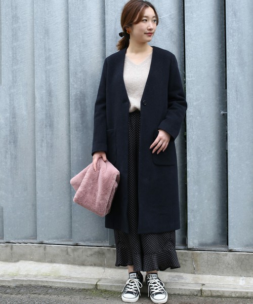 羊絨無領大衣外套與休閒風格相當好搭配,也是今年受矚目的單品♡ 能夠帶出優雅卻不失休閒的感覺。搭配流行圓點圖案或休閒運動鞋也能凸顯大人的休閒風格。