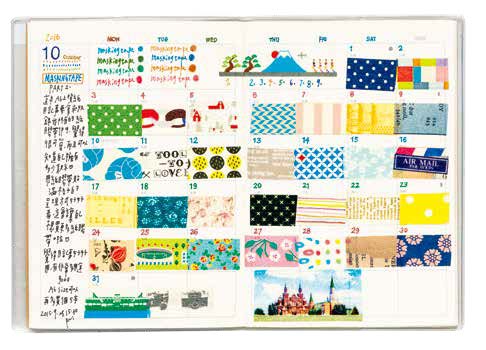 自己製作的自填式月記事筆記本,畫上插圖後再使用紙膠帶妝點頁面