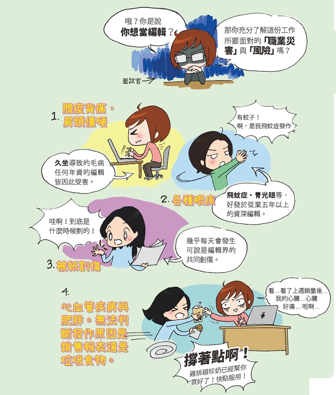 編輯工作最常遇到的職業災害,遠不只是常常被紙割到手這麼簡單。最首要的職災,就屬肩頸痠痛了。不只是編輯,所有常要伏案工作的職業都有這個毛病。以前以為認真工作賺了錢,可以買漂亮衣服、做臉做指甲,當個時髦都會女性,結果錢全部都拿去按摩了,真是令人咬牙切齒。