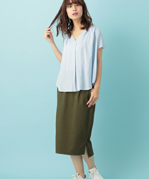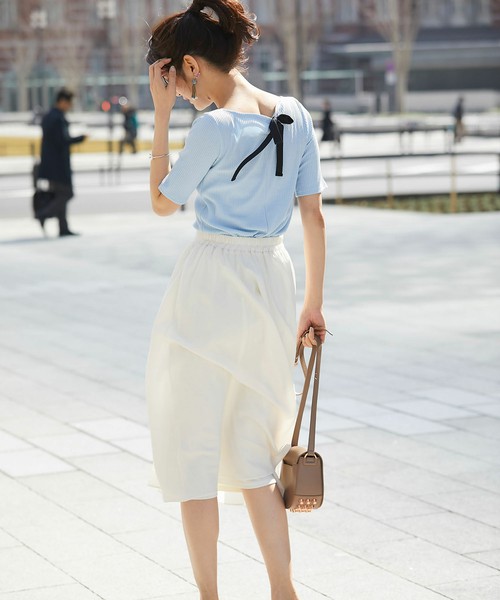 背後有個蝴蝶結的上衣,若選擇薩克森藍便能減低甜美感,不喜歡可愛風格的人也可以輕鬆穿搭喔!下半身搭配白色服飾,更添清爽感。
