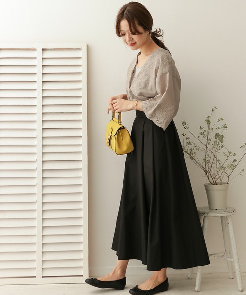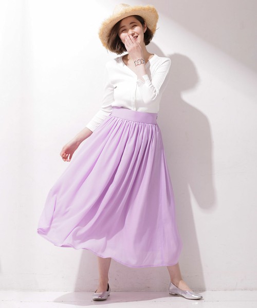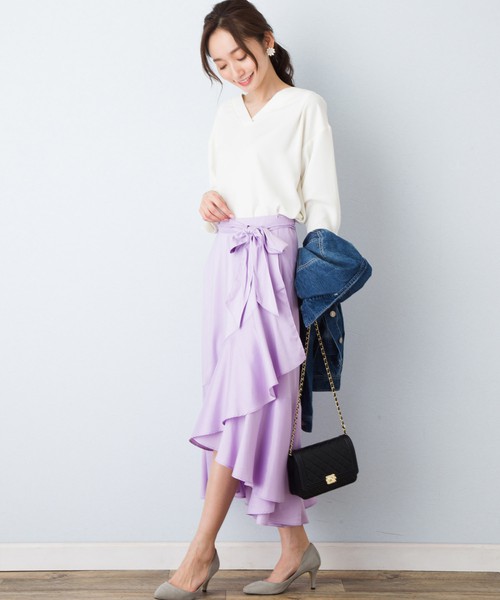 大片波浪摺邊令人印象深刻的淑女風長裙,若選擇薰衣紫,也能表現成熟女性的氣質呢。因為不會顯得過於可愛,也可以運用於俐落風格的穿搭。