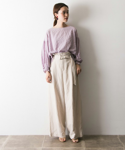 薰衣紫色的上衣,搭配淺杏色長褲,不但很有春季氣息,也能凸顯女性特有的柔和感,是很成熟可愛的穿搭♡即使是褲裝,也可以充分表現可愛感呢!