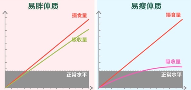 所謂的易胖易瘦體質,差別不在於吃進去的東西有多少,而是吸收進身體裡的"量"。易胖體質的人,吃多少吸收多少,但易瘦體質的人,身體只會吸收"需要的量",最終導致「吃再多也不會胖」的體質。