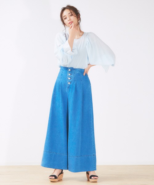 衣袖寬大的澎澎袖絲質襯衫搭配寬版丹寧褲營造出輕鬆率性的穿搭。絲質襯衫擁有柔軟的質地與蓬鬆立體感,實現惹人憐愛的成熟風格。