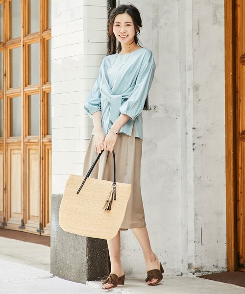 在腰間隨意打結的腰帶設計,是一款十分具有當季感的上衣,沉穩的藍色搭配編織材質就能打造出自然不做作的成熟風流行穿搭♡竹織包和涼鞋更提升了季節感。
