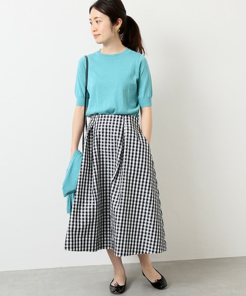 深受成熟女性喜愛的簡易設計針織衫,若選擇天藍色就變成了鮮豔且更高層次的穿搭風格。搭配格紋棉裙,能讓水藍色更加顯眼喔。