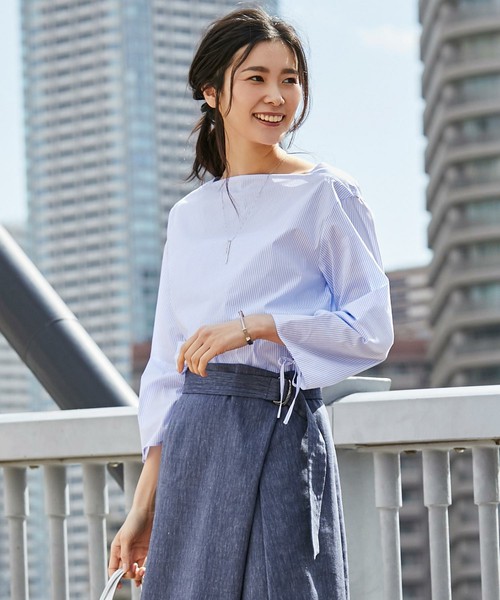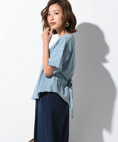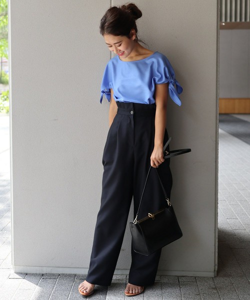 清涼感藍色女性襯衫在袖子上的綁帶設計顯得相當可愛♡ 腰間有打摺的褲子是今年的流行款式。其他單品也都利用深色來搭配的話,即使是綁帶設計的可愛上衣也能變成大人風的純熟感穿搭。
