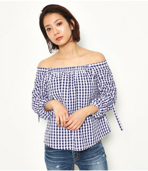充滿女人味的露肩上衣即使是格紋設計也不會顯得孩子氣呢。藍白相間的格紋更顯清爽◎利用丹寧褲的簡單穿搭,能營造出健康率性的女性穿搭風格喔。