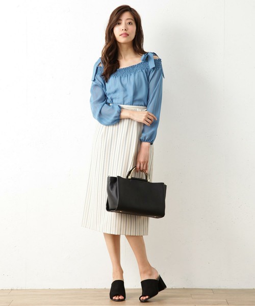 肩膀附有緞帶設計的露肩上衣,微深的藍色與微微外露的肌膚形成絕妙平衡,而且不會看起來過於可愛。穿上條紋緊身裙後,就能完成一套成熟女孩的可愛休閒穿搭。