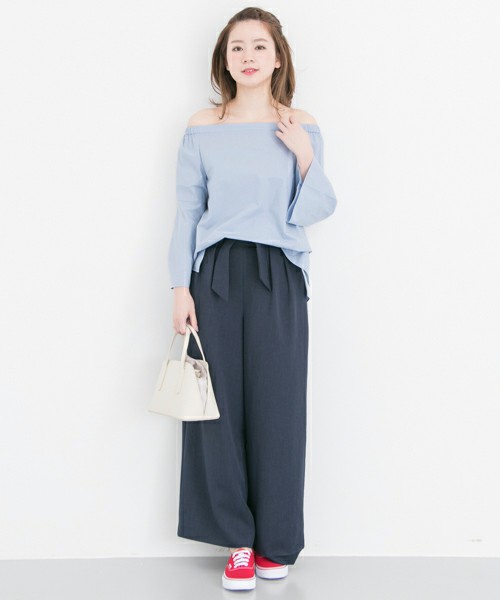有彈性的棉質露肩上衣,重點在於穿起來既輕鬆又不會過於性感,寬褲和運動鞋的搭配,就能完成稍微降低可愛度的休閒風格,很推薦給成熟女孩們!