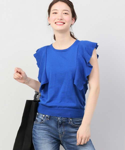 鮮明的藍色配上大波浪形荷葉邊上衣,讓簡單的丹寧褲穿搭感覺更加有型。針織質地更能凸顯身體曲線,即使是輕鬆隨興的穿搭也能展現成熟韻味。