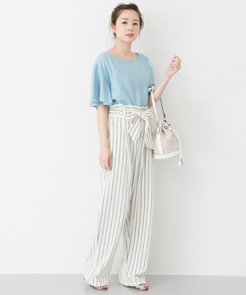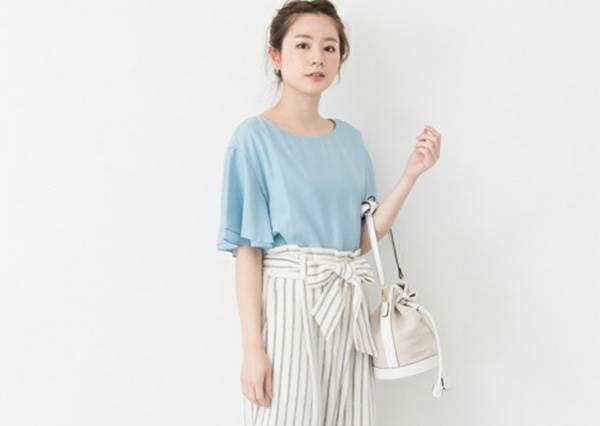 淡藍荷葉袖襯衫上衣造型簡約且不會過於甜美,是非常好搭配的單品。搭配條紋寬褲就變成清爽的夏季衣著。