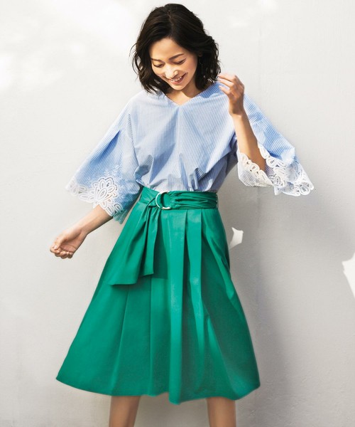 奢華的蕾絲刺繡喇叭袖襯衫能讓人產生華麗的印象。V領及直條紋的設計平衡了可愛度,即使是成熟女性也可毫不猶豫穿上身,可說是主角等級的上衣!若再搭配春夏備受矚目的清新綠色及膝裙的話,可營造出類拔萃的時尚潮流感。