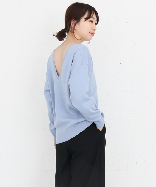 背部深V領的簡單款針織上衣能散發出女人味。即使是寬鬆舒適的成熟風輕鬆穿搭,只要搭配黑色下身的話就能顯得較為正式。